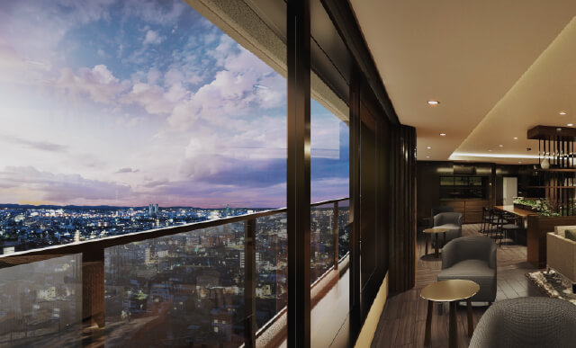 ※掲載のスカイラウンジ完成予想CGは、計画段階の図面を基に描き起こした完成予想CGに現地約60m(20階相当)の高さより南西方向を撮影した写真(2024年5月撮影)を窓外に合成しCG加工したもので、実際とは異なります。また、変更となる場合がございます。給気口、スリーブ等、一部再現されていない設備機器がございます。またタイル・石貼等の大きさは実際とは異なります。共用部の家具・備品等の形状・色等は今後変更となる場合がございます。また、周辺環境、眺望は将来にわたり保証されるものではございません。