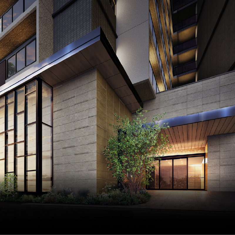 ※掲載のエントランス完成予想CGは計画段階の図面を基に描き起こしたもので、実際とは異なります。また、変更となる場合がございます。雨樋、給気口、スリーブ等、一部再現されていない設備機器がございます。また、タイル・石貼等の大きさは実際とは異なります。植栽は計画段階のものであり、変更となる場合がございます。また、入居時を想定して描かれたものではございません。葉の色合いや枝ぶり、樹形は想定であり、竣工時には完成予想CG程度には成長しておりません。