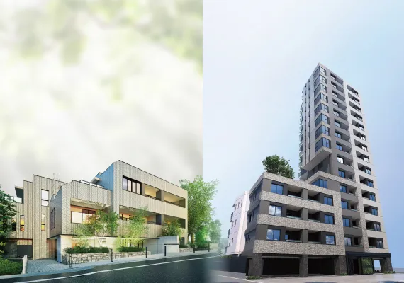 ※掲載の外観完成予想CGは計画段階の図面を基に描き起こしたもので、実際とは異なります。また、変更となる場合がございます。雨樋、給気口、スリーブ等、一部再現されていない設備機器がございます。また、タイル・石貼等の大きさは実際とは異なります。植栽は計画段階のものであり、変更となる場合がございます。また、入居時を想定して描かれたものではございません。葉の色合いや枝ぶり、樹形は想定であり、竣工時には完成予想CG程度には成長しておりません。周辺の建物等はライン等で表現しております。周辺環境は将来にわたり保証されるものではございません。