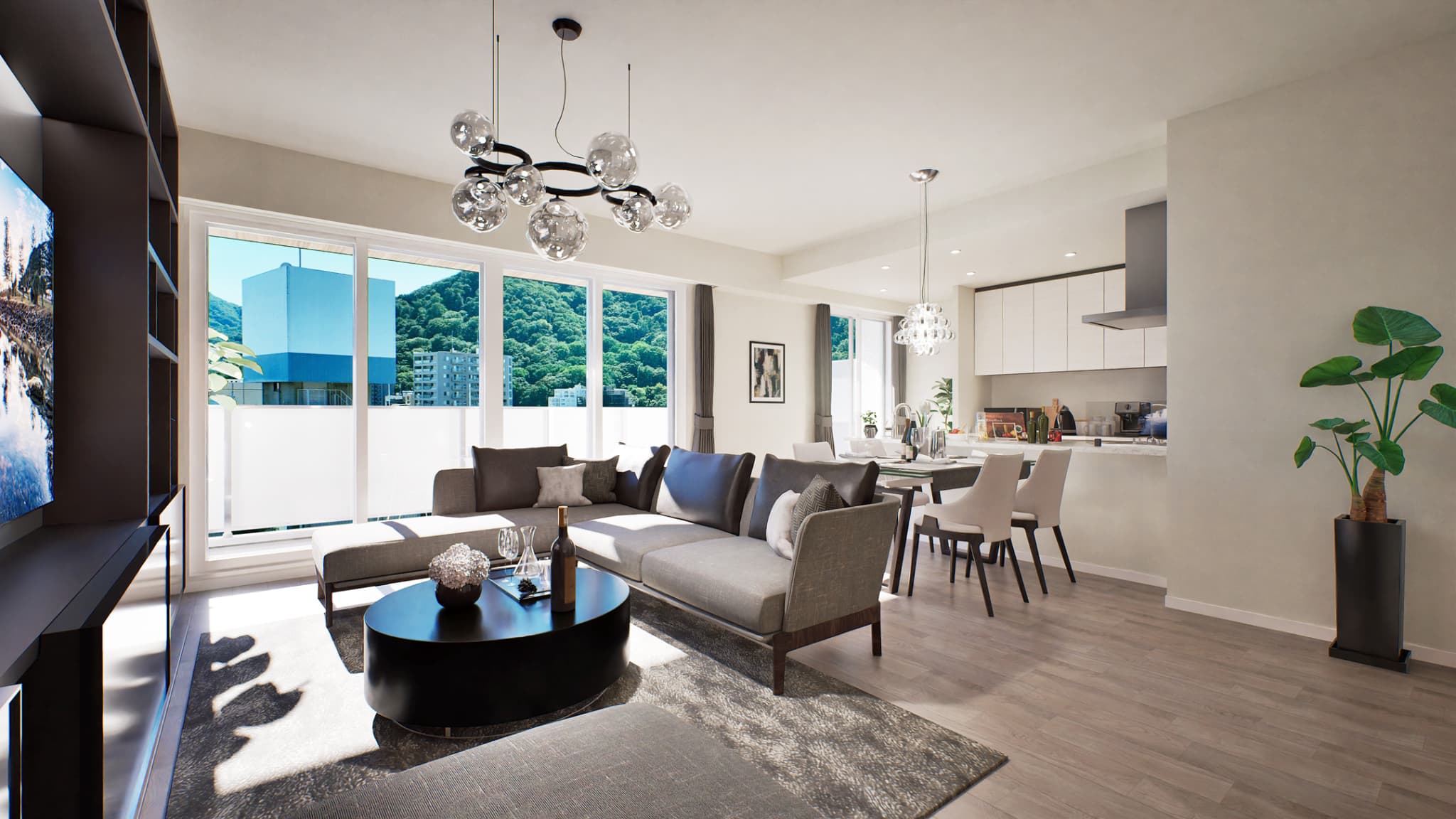 ※掲載のIタイプ、リビング・ダイニング完成予想CGは計画段階の図面および各素材写真を基に描き起こしたもので、実際とは異なります。また変更となる場合がございます。給気口、スリーブ、スイッチ、コンセント等、一部再現されていない設備機器がございます。また柱型の梁型の出幅、梁下(下がり天井)の寸法等はお部屋のタイプ、階数により異なります。有償オプション、個別設計変更の他、家具・備品等は販売価格に含まれておりません。無償セレクト・有償セレクトには申込期限があります。また有償オプションはお部屋のタイプ、階数によって設置できないものがございます。窓外の眺望写真は現地約30m(10階相当)の高さより南西方向を撮影(2024年8月)した写真をCG加工したもので、実際とは異なります。また周辺環境、眺望は将来にわたり保証されるものではございません。